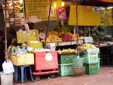 Het is half acht ’s avonds en ik zit op het overdekt terras van het hotelrestaurant te kijken hoe de regen met bakken naar beneden komt. Enorme herrie op het afdak. Geen weer dus om ergens buiten wat te gaan eten. Maar hier is ook Singha bier en prima Tom Yom Koong, scherpe soep met kokosmelk en garnalen. Best wel even uit te houden dus. Vandaag een loop- en openbaar vervoer dag. Met de Skytrain het centrum in en wat rondgelenterd. Beetje vroeg want ik wilde een kijkje nemen in MBK mall maar die ging pas om 10 uur open terwijl ik er al om negen uur voor de deur ston; uitslover! Nog een uurtje in een park zitten lezen en verder. In de middag in Thonbury aan de wandel, het stadsdeel waar ik nu slaap. Vlak achter het hotel is een grote markt, de Charoen Rat Market en daar worden wij blij van. Ook wezen kijken op het dichtbijgelegen Wiang Wai station. Een heel lang perron langs een enkele rails . Het perron is grotendeels in beslag genomen door een eindeloze rij eetstalletjes. De trein staat nog te wachten en hier en daar roept een passagier een verkoper om wat eten of drinken aan te reiken door het raam. En ik, sukkel, had net mijn camera niet mee. Verder nog iets lekkers gegeten dat ik niet kende. Rood gekleurd deeg met stukjes boontjes er in. En dat als oliebolletjes de olie in; dezelfde wadjan waar ook nog een vis in ligt te spetteren. Dat maakt hier niet uit. Het wordt geserveerd in een plastic zakje met schijfjes komkommer en zoetzure saus. Lekker dus.