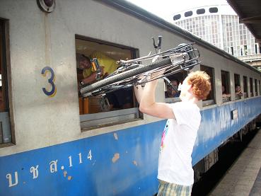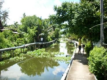 Dan naar Hua Lamphong, het centraal station van Bangkok. De trein naar ver buiten Bangkok maar toch in Bangkok. De trein staat er al, de locomotief nog niet. De fietsen tillen we door het raam naar binnen; alles kan hier. 5 bath voor de buitenlanders; 0 bath voor de Thai, als het maar een stoptrein met houten bankjes is dan hoeven zij niet te betalen. Niet alleen fietsen gaan er in, sommigen hebben hun hele handel mee. Een klein uur rijden en dan moeten de fietsen er weer uit. Dat gaat prima met de hulp van nog wat passagiers, iedereen lol. Dat op weg, zoals gezegd buiten Bangkok maar nog steeds in Bangkok. Direct bij het station beginnen de klongs, de kanalen al. Met aan weerszijden betonnen fiets/wandel/bromfietspaden op het water. Metertje breed en geen reling. Maar ja, als je in Chinatown kunt fietsen, dan lukt dit ook. Tegenliggers wachten altijd beleefd tot je gepasseerd bent. Malle mensen. Ze moesten eens weten hoe het bij ons gaat. Verder door de groene weelde. We fietsen door een gebied waar overwegend moslims wonen. De kleding en de moskeeën is het enige dat hier anders is. En ze eten geen varkensvlees legt Ad ons geduldig uit. Soms haalt iemand een visnet op, grote vierkante netten die in de klong liggen en de boven het net zwemmende vissen verrassen. Grote vissen gaan de buik in, kleine vissen in een soort bun. Die worden vetgemest tot ze groot genoeg zijn voor de buik. Inmiddels is de zon gaan schijnen en wordt het warmer. Is niet erg want er staat ook een windje. Eindje fietsen, cola stop, eindje fietsen, lunchtijd. Sprookjesrestaurant of beter gezegd afdak over het water. De schalen blijven op tafel komen. Co van Kessel had het in de folder al beloofd; de dagtochtgangers krijgen een uitgebreide lunch en in Thailand is uitgebreid ook echt uitgebreid! Na de lunch nog een flink eind fietsen; mijn band moet opgepompt worden. Dan gaat mijn trapper loslaten, hij draait langzaam van de trapas af. Best hinderlijk maar het humeur is zo perfect dat het niets uitmaakt. Iedere 10 minuten even vastdraaien. Ad, de gids, brengt ons naar een fietsenmaker. Die sleutelt en dat helpt…. Een half uur. Ach, wat geeft het ook. Langs de klong waardoor wij straks de boot gaan nemen terug naar het centrum.