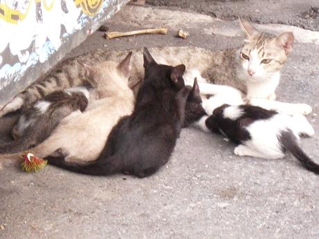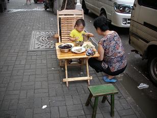 Links: Alles gebeurt hier op straat, dus ook de kinderen eten geven