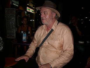 Foto rechts: Ton 'ik ga echt niet op een krukje zitten' bij live optreden in Rambuttri straat, Bangkok
