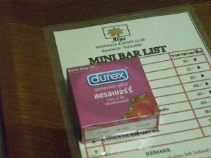 De service gaat hier wel een beetje erg ver want op de koelkast liggen ook condooms als onderdeel van de Mini Bar. En de prijs van de kamer is 12 Euries per nacht; slaat de crisis toe? Zelfs de minibar is okay, 25 bath voor een cola en 40 bath voor een biertje, dus 60 cent en een euri. Daar wordt een Hollander blij van!