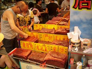 Links: Bakkwa of Rougan (肉乾) is gezouten en gezoet gedroogd vlees in dunne plakken. Meestal varkensvlees maar soms ook rundvlees. Het is een manier van vleesconservering uit het oude China. De verkoper knipt het in smalle reepjes en doet het voor de klant in een plastic zakje.