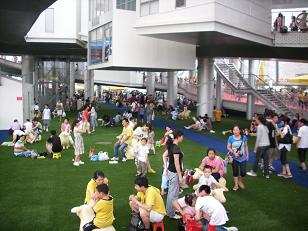 Heel groot en ook heel druk. Veel audiovisueel geweld maar eerlijk gezegd ook heel weinig informatief; ik denk dat de gemiddelde reisbeurs in Holland meer info geeft. Terug naar het NL paviljoen. Daar is al heel veel over te doen geweest, in positieve zin dan. En ik moet zeggen dat het eigenlijk ook heel verfrissend is tussen alle al dan niet mooi vormgegeven hallen. Het is transparant; je gaat niet naar binnen maar loopt er doorheen. Letterlijk dus. Omhoog en weer omlaag langs kleine aanplakhuisjes waar je naar binnen kunt kijken naar iets “typisch” Nederlands. Veel kijkers bij de Tiara van Maxima die in het groot geportretteerd aanwezig is. Ook die Maxima is typisch NL kennelijk. In ieder geval niet Duits zoals de rest van haar schoonfamilie en dat scheelt weer. En op de grond grastapijt in de kleuren groen en paars. En op dat grastapijt mogen de mensen zitten, tussen de verplaatsbare kunststof schapen. Daar slepen kinderen mee, gaan er op zitten, worden gefotografeerd en gaan er naast liggen. Echt leuk; voor alle mensen in een ultieme menselijke maat.