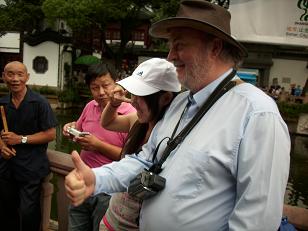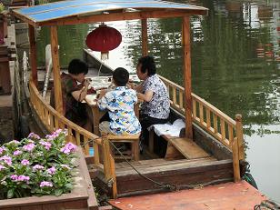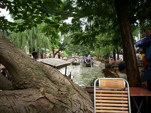 In dat waterrijke achterland liggen een aantal “waterstadjes” die zich kenmerken door kanalen, stenen bruggen over die kanalen die de oude straatjes met elkaar verbinden, kleine vaak witte huisjes, tempels en tuinen en meestal niet toegankelijk voor auto’s. Zo een stadje is Zhujiajiao, uitgesproken als tsjoejajaa. Ik ben daar de vorige keer ook geweest maar toen was het veel drukker. Omdat mijn reisgenoot een broertje dood heeft aan de benenwagen en het openbaar vervoer, zijn we niet met de bus, want naar haltes moet je lopen, maar met de taxi gegaan. En in Zhujiajiao met een bootje waarin je tegen betaling door de kanaaltjes wordt gevaren. Eigenlijk ook best eens leuk. Thee gedronken in te kleine stoeltjes en gegeten. En toen moest er eend op tafel komen en hoe doe je dat in het Chinees? Een eend nadoen dus. Mijn acteerprestaties leidden er echter toe dat er kikkerbilletjes op tafel kamen in plaats van de door mijn reisgenoot zozeer begeerde eend. Kennelijk een te gering fonetisch verschil tussen kwek en kwak!
