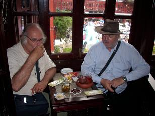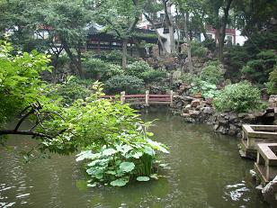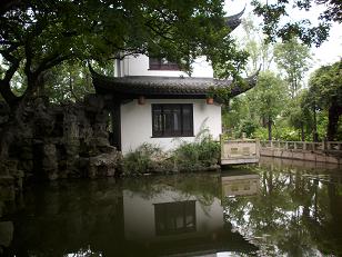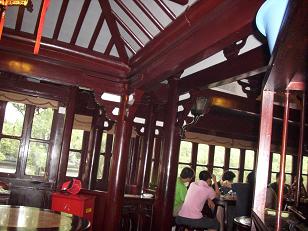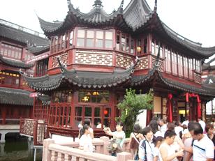 De oude stad van Sjanghai, althans wat daar na een vernietigende restauratie nog oud aan is. Toch leuk. Veel winkels, heel veel winkels. Juweliers, kleding, prullaria. Wel aanzienlijk minder druk dan de vorige keer maar toen was het Chinees nieuw jaar en bovendien avond. Nu is het een gewone doordeweekse dag en kun je gewoon lopen. Over de zigzag brug met negen hoeken. Dat was nodig omdat boze geesten dom zijn en alleen maar rechtdoor kunnen lopen en in de war raken als ze steeds de hoek om moeten. Wij zijn slim en bereiken het 400 jaar oude vijfkantige theehuis Huxinting , waar we aanschuiven voor een