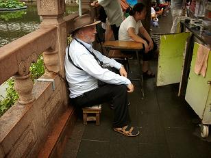 Op weg naar Sjanghai. Vroege vlucht naar Bangkok omdat iedereen zegt dat er wel eens vluchten gecancelled worden en ik niet wil meemaken dat ik het vliegtuig naar Sjanghai mis. Al vroeg, 14:55, in Bangkok dus. Dat wordt wachten tot 01:55, althans dat dacht ik toen nog. Eerst bagage in depot en dan met een “free ticket” de Airport Express Train naar Bangkok. Eindstation Phaya Thai, midden in de stad. Kunnen we overstappen op de BTS, de Skytrain. Ton moppert nog wat dat de systemen niet op elkaar aansluiten, ik vind het prima. Nooit meer file als je de stad in wilt. Van de Skytrain de Chao Pray Express Boat naar Banglamphoo waar ook Khao San Road ligt, het backpackers paradise dus. Ben benieuwd wat Ton er van gaat vinden. In dat deel van Bangkok is hij nog nooit geweest; daar hoor je boven de veertig ook niet te komen. Eerst acclimatiseren; een drankje op een terras aan de rivier. Dan de drukte in; voorzichtig verder, vis eten in een eethuis op Soi Rambuttri. Dan verder langs de restaurants, bars en winkeltjes. Nog wat drinken en tenslotte bij een kroeg op de stoep gezeten waar twee gitaristen en een zangeres ons vermaken met blues en rock; schot in de roos.