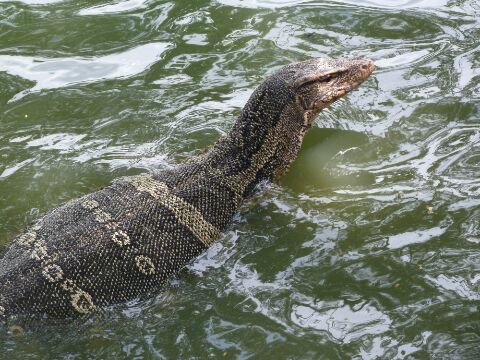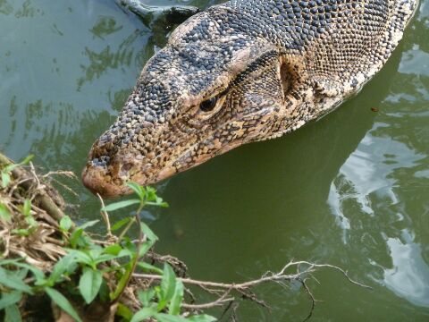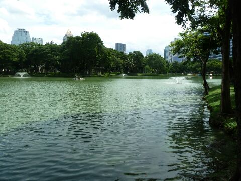 Zoals het prachtige Lumpini park. Wie loopt, ziet nog eens wat. Door de zakenwijk tussen Surasak en Lumpini park gewandeld. Het is lunchtijd (het is hier overigens bijna altijd etenstijd) en dat betekent dat de straatstalletjes overvol zitten met kantoormensen. Lumpinipark doet mij een beetje aan Central Park in New York denken; een park temidden van de wolkenkrabbers maar dan anders. Veel palmen en minder mensen. Hier moet het volk werken, vaak 15 uur per dag en niet luieren zoals in de US. Bij een grote vijver zwemt/loopt een grote leguaan van ca. 2 meter traag met me op in het water. Hij/zij stelt mij uitgebreid in de gelegenheid foto's te nemen. Ik kan met mijn camera op een metertje afstand komen; geen spoor van verlegenheid. Een fascinerende ontmoeting.