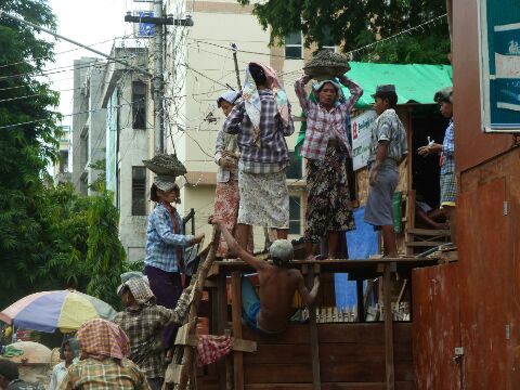 Yanghon is niet echt of eigenlijk helemaal niet op toeristen ingesteld. Omdat ik nog steeds geen behoorlijke kaart heb dool ik maar wat lukraak door de stad. Is ook leuk en ik heb de tijd. Soms weet ik niet waar ik ben maar dan komt er wel weer een herkenningspunt. Bij toeval rij ik tegen een toeristen info aan. Groot kantoor met vier dames achter de balie en hoog in de lucht achter glas de chef. Ik zal deze morgen wel de eerste en de laatste klant zijn. Ik vraag een kaart vn Yangon. Na lang zoeken onder de balie en in een kast komt er alleen een kaart van Bagan tevoorschijn: solly, solly, solly. Heb ik dus niets aan. Dan komt een van de andere dmes in beweging, zij heeft in haar tas nog een kaart van Yangon. Die mag ik wel kopen; 200 Kyat. Volgens mij gewoon een privé handeltje, het is geen echte kaart maar zo een ding die je overal bij iedere VVV gratis krijgt. Maar ik ben er blij mee.