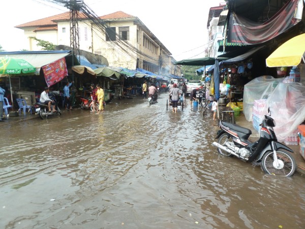 De dag eindigt net als een paar dagen geleden in Bangkok, een oorverdovende en zware stortbui. Vrijwel zonder aankondiging; nauwelijks tijd om alle tafels en stoelen naar binnen te sjouwen. Uit alle hoeken en gaten stroomt het water. De steeg, waar ook tafeltjes staan, blijft van boven droog maar de vloer wordt een wilde waterstroom. Tuktuk chauffeurs voeren een toneelstukje op; zij maken zwembewegingen op de ondergelopen straat. Na een half uur houdt het op. Na nog een half uur is het water weer van de straat. Eigenlijk is het heel spannend, zoveel water, zoveel lawaai van het neerstortend water, donder, bliksem. Prachtige voorstelling.