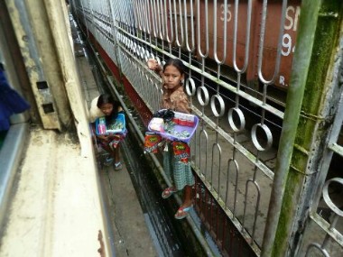 Kinderen die stiekum van alles verkopen, tussen trein en hek.