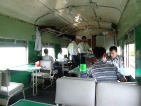 Ik kan mij niet herinneren wel eens over zoveel bruggen, kleine en grote, te hebben gereden. Kleine bruggen geven minder lawaai, grote bruggen meer omdat je dan tussen het staal doordendert. Het is niet echt een rustige reis. Ik was al gewaarschuwd dat het spoorwegnet dringend aan verbetering toe was maar dat het zo erg zou zijn had ik niet kunnen vermoeden. Er waren momenten dat ik serieus dacht dat de wagon uit de rails zou springen zo ging het tekeer. Eenmaal in de restaurantiewagen, goede "fried rice" overigens, moest ik wachten tot de trein even niet aan het dansen was alvorens een slokje bier te nemen en dan nog ben ik aantal keren verrast als de trein weer een sprongetje nam. Met het ondergaan van de zon gingen de luiken van de coupé dicht. Omdat ik nog niet ging slapen twee filmpjes gezien. Bedankt Sharon. Slapen ging letterlijk met horten en stoten. Soms ging het zo te keer dat ik wakker schrok.