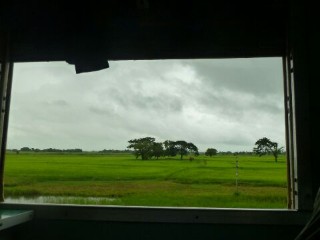 Alleen in een vierpersoonscoupé, niet omdat ik dat zou had geregeld maar omdat er gewoon niet niet zoveel passagiers waren voor de upperclass. Is nog geen 1e klas maar de klasse tussen de 1e en 3e in. De trein rijdt niet hard en dat is veel leuker want het landschap trekt dan ook langzaam aan je voorbij. De delta is vlak en het verschil met Holland is niet zo groot. Hier groeit geen gras maar rijst en dat ziet er net zo groen uit. De huisjes zijn natuurlijk wel kleiner. Er is wel een opvallend verschil; het is hier veel natter. Op veel plaatsen staat het land nog onder water en moeten mensen over inderhaast aangelegde verhogingen naar hun huis of waden ze soms gewoon door het water. Kinderen spelen voetbal, beetje op het droge, beetje in de modder. Maar ze hebben er duidelijk zin in. Er zijn zoveel momenten dat ik naar mijn camera grijp om de oneindige groenheid vast te leggen maar het gevoel krijg ik er niet in. Op een
