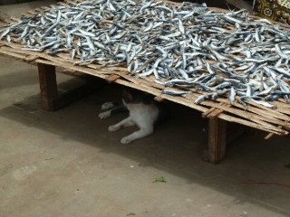 boven: Een meisje op de markt maakte bloemenslingers; deze gaf ze aan mij omdat het zo lekker rook | | boven: Hier heet het niet het spek op de kat binden maar de vis op de kat leggen |
