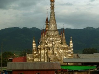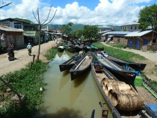 Vannacht om 04:00 uur met de nachtbus van Mandalay in Nyaungshwe aangekomen. Verbazingwekkend hoe goed het systeem werkt, zonder computers. Met de telefoon wordt alles geregeld; om zes uur precies wordt ik bij het hotel afgehaald en achter in zijn open taxibusje geladen. Die zit al half vol met vracht en mensen maar zal nog voller worden want overal worden nog mensen opgepikt. Naar later blijkt allemaal voor dezelfde bus. Voor de bus afgezet. Oude Chinese bus maar in prima staat met verstelbare stoelen en aircon. Na een vlak stuk gaat de bus de bergen in. Klimmen, dalen, klimmen, dalen. Soms zag je beneden lichtjes van een dorp. Eigenlijk jammer dat er geen dagbus gaat want het zal een mooie tocht zijn geweest. Nyaungshwe is een dorp aan de Noordzijde van het immense Inle meer. Het dorp is verstild maar niet stil. Verstild in de zin dat ook hier de tijd lijkt te hebben stilgestaan. De meeste mensen lopen in tradionele kleding, soort sarong dus. Een paar nieuwlichters dragen jeans. Net als bij de Schotten kriebelt er een nieuwsgierigheid omhoog wat er dan wel onder gedragen wordt. Omdat ze altijd zitten te frotten aan die sarong om hem weer strakker om het lijf te trekken, moet het eerst los en wijd; en de keer dat het eventjes te wijd ging zag ik blote billen. Maar, 1 vogel maakt nog geen zomer dus daarmee is de nieuwsgierigheid niet bevredigd.