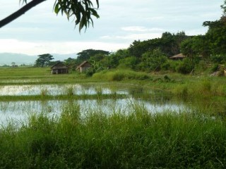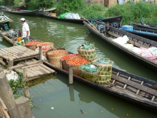 Traag varen de volgeladen bootjes voorbij. Geen idee waar al die vracht naar toe moet of nodig is. Zoveel mensen lijken hier niet te wonen. Ook de markt is heel groot en goed voorzien met van alles en nog wat.Het dorp is niet groot en na 10 minuutjes kopen sta je buiten, in de rijstvelden. Eind van de middag, de zon is al aan het zakken en is nog maar een paar stappen verwijderd van de bergtoppen. Net buiten het dorp is een duur restaurant, wel met een terras op de eerste verdieping met uitzich over de rijstvelden, de bergen en de ondergaande zon. Extravaganza wint het vanavond van de Hollandse zuinigheid. Het eten was goed, de bediening voortreffelijk. Drie mensen voor de enige gast. Dat komt omdat het rain season is zeggen ze. Vandaag alweer geen regen gezien. Ik ben lang blijven zitten en het was het waard.