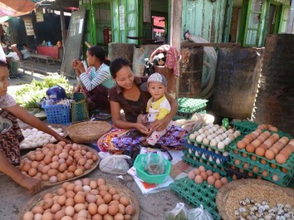 Iets over het eten. Het aanbod op de markt is anders dan in Thailand en Indonesië; veel bloemkool, aardappels, druiven, appels en peren.Ook veel kastanjes. Duidelijk andere cultuur. In het hotel hebben ze geen Birmees ontbijt, wel toast, jam en eggs. Scrumbled als je dat wenst. Veel zoet en moddervet. Er lekt hier ergens een spijsoliebron. Thee net als in India, heet, veel melk en mierzoet, alleen de kruiden ontbreken. Toch de Britse achtergrond. Bij het eten, of dat nou rijst of bami is, een schaaltje gesneden uien met tomatenketchup. Apart. Net als overal in Azië zijn de restaurants overbevolkt met personeel. Gistermiddag heb ik geprobeerd te tellen. 12 jongelui. Maar ik vergat de keuken nog, daar liepen er nog vier door elkaar. Eigenlijk wel meer dan elders. En erg jong. Aan de jongens is het niet zo goed te zien maar ik denk zo rond een jaar of 12 13. De meisjes lijken ouder maar dat komt denk ik meer door de bodyshape dan door de gezichtjes. In de restaurants ook veel irritante (mannetjes)klanten. Macho is in hier. Om de haverklap wordt de bediening gesist voor nop en gekoeieneerd. En maar interessant kijken en met de mobiel spelen. Hoezo vriendelijkheid van het Boedisme. Het eten wordt neergezet maar ik zie niemand bedanken of zelfs maar vriendelijk lachen. Wel tegen mij maar ik ben geen Birmees. Vandaag om het paleis gefietst. Is mega groot, in het vierkant zeker 10 kilometer als je er rondom heen fietst en dat heb ik gedaan. Iedere zijde van het vierkant is meer dan 2 km en in ieder stuk zit een poort. Drie voor de Birmesen en 1 voor buitenlanders. Die moeten dan ook meteen 10 dollar betalen. Niet dus. Ook Mandalay hill ben ik niet omhoog gelopen maar van beneden af gekeken. Ook leuk. Als reizigers aan je vragen wat je hebt gedaan of wat je hebt gezien komt er steevast een teleurgesteld antwoord van o, maar heb je dat dan niet gedaan of gezien. Ja, dat is waar maar je hoeft niet alles te hebben gezien of gedaan. Dat gaat mij hier ook niet lukken. Voor morgen een (nacht)busticket gekocht naar Inle Lake, mijn volgende bestemming. Bagan gaan het niet worden deze reis. Misschien een volgende keer.