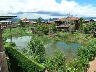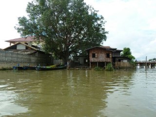 Heho, vliegveld. Vanmorgen vroeg opgepikt in Nyaungshwe. Tijd om even terug te kijken op mijn plattelandservaringen hier. Het prettige van het regenseizoen is dat de toeristen weg blijven. Het grote geheim van het regenseizoen is dat het niet altijd regent of even maar wel hevig. Gisteren met een boot het Inle meer op. De kosten gedeeld; met Dominique, een Franse verpleegkundige die van reizen en trackings houdt en met Alla, een Russische schilderes die in India werkt en woont. Met zijn drieen een hele leuke dag gehad. Geen taalproblemen want Dominique spreek Frans en Engels en Allla spreekt ook goed Engels en Frans, zij heeft in Lyon gestudeerd. Zeer onderhoudend gezelschap; Alla weet veel over het Boedisme en India en kan daar met veel passie over vertellen; Dominique heeft in Maleisie gewerkt met illegalen uit Myanmar die heel vaak HIV hebben. Bovendien, een heel vrolijk gezelschap, heel veel gelachen. Alla is die nacht aangekomen in Nyaungswhe en hoopt op een (boot)lift naar een klein waterdorp waar zij een paar nachten wil blijven. Zij heeft in Mandalay kennis gemaakt met de Birmese Eigenares van een huis daar en die heeft haar gezegd dat ze daar een paar dagen kan blijven. Dat loopt uiteindelijk anders af. De oude vrouw die op het huis past durft het niet omdat het in principe verboden is om buitenlanders te huisvesten. En er is geen telefoon in de buurt en mijn lokaal beltegoed is op. Dus er zit niets anders op dat Alla mee terug vaart naar Nyaunswhe. Dat betekent dat we de rest van de dag met zijn drieen blijven. Het Inle meer is enorm groot en is niet echt diep. Eigenlijk is het een laagvlakte tussen de bergen die gewoon volgestroomd is. De mensen leven in en op het water. De huizen staan op palen en zijn te bereiken via een wirwar van dijkjes en bruggetjes.