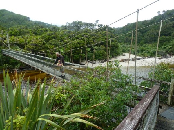Er kleeft een groot nadeel aan deze paradijselijke plek: sandflies, zandvlooien! En niet eentje, niet tien maar duizenden. Zo gauw als je ergens gaat zitten komen ze opzetten. Het zijn kleine vliegjes die behoorlijk steken. Ik, die nooit last heb van muggen, word tot bloedens toe gestoken door deze krengen. Ik heb geen deet meegenomen. Ook niet een van de lokale middeltjes. Er is maar 1 remedie, gaan lopen. Het is een uur lopen naar Scotts Beach, letterlijk over bergen en dalen. Door een woud van Nikau palmen, een plaatselijke specialiteit. De tocht vangt aan over een hangbrug die best stabiel zal zijn maar niet zo aanvoelt.