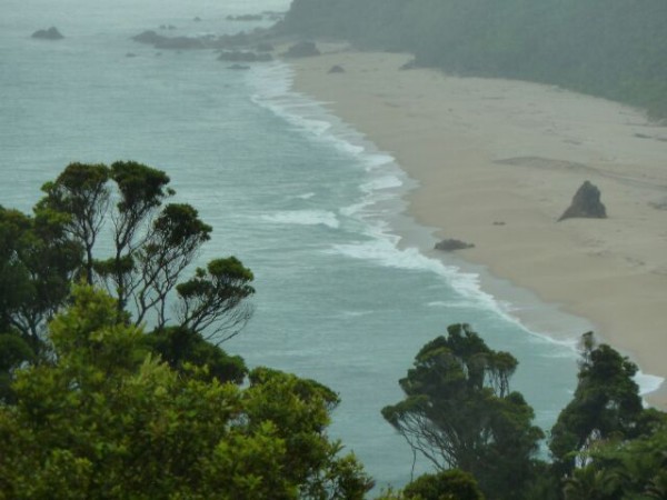 Het strand is prachtig maar ook hier sandflies. Ik ben gaan liggen met mijn jack over mijn hoofd, mijn zakdoek ter afsluiting en mijn handen diep in mijn zakken. Wat moeten die stakkers die hier in korte broek lopen en in een T-shirt? Maar goed, veel te zien en oneindig goed voor mijn conditie. 's-Avonds White bait gegeten. White bait is de lokale specialiteit. (te) kleine visjes van een centimeter of twee die twee maanden per jaar in de riviermonden met schepnetten gevangen worden en een delicatesse heten te zijn. Ze worden als omelet geserveerd. Absoluut smakeloos. Niet vies maar goed dat ze in een omelet zitten, dan proef je in iedergeval ei. In Auckland wordt er 65 $ per kilo voor betaald. Alles proberen, dus dit ook. Terug met de auto; links rijden, links stuur, donker en de zeer steile helling bij Rick op. En dat gaat allemaal goed.