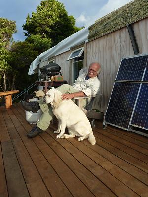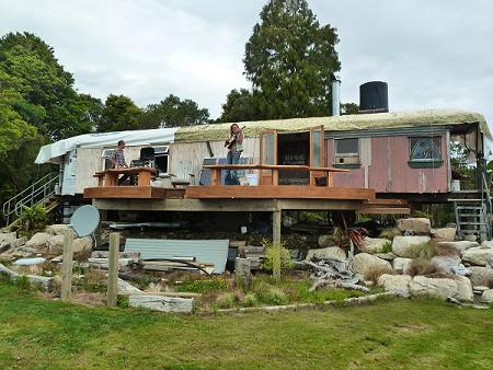 Er moet nog heel wat gebeuren. De plek is prahtig en vanuit het terras dat ze voor de wagon heeft aangelegd heeft ze uitzicht over de lagune en de zee. Ook hier moet je voor je eigen water (regen), elektra (zonne-energie), verwarming (hout) en toilet (composttoilet) zorgen. Op een stuk grond van meer dan 20 hectare, grotendeels bos. Rick gaat haar helpen met een nieuwe zonne-installatie en het vernieuwen van alle bedrading. Kiwi eten, vlees, worst, meer vlees en sla. Lief en ongelooflijk handig mens. En niets is afgesloten. Overdag, als ze werkt, staat alles open want anders kan de hond er niet in of uit. En de stalen container naast de wagon, waar veel kostbaar gereedschap ligt, staat ook altijd open. Hier aan de West Coast heb je geen criminaliteit.