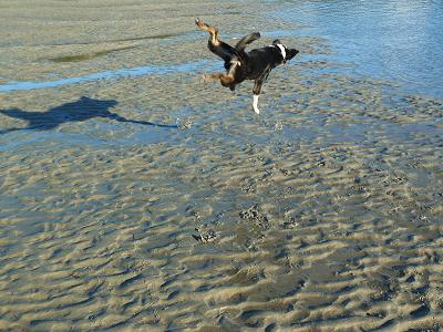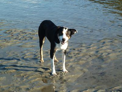 Intermezzo: de circushond. Het lijkt gewoon een lieve bastaard border collie. Slim; hij loopt met mij en Stu mee naar de rivier, waar Stu zich te water gaat laten. Bij de rivier gekomen lukt het de hond om mij duidelijk te maken wat hij erg leuk vindt; met water gooien. Dat vangt hij op. Sterker nog, hij doet er een salto achteraan. Met veel moeite lukt het mij een foto te maken van de in de lucht zwevende hond. De hond spreekt overigens goed NL; Zit (sit) en kom hier (come here) doet hij perfect.