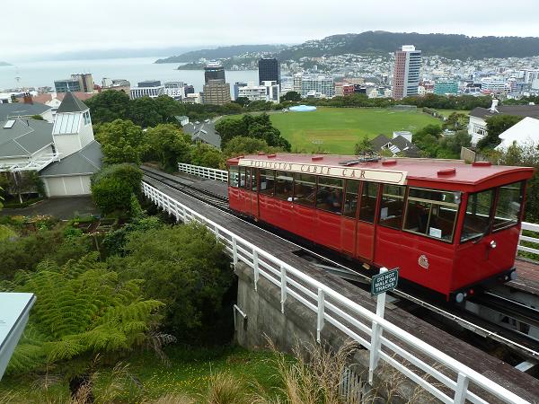 Ik begin met een wandeling naar de cable-car. Het heeft rails en gaat omhoog. Een van de oudste cable-cars, 1902, (funiculairs) die er nog zijn. De voorgaande door mij genoten funiculairs in volgorde van 1ste gebruik: Lugano (Zwitserland), Haifa (Israel), Santiago de Chile (Chili) en Penang (Maleisie). Misschien vergeet ik er eentje. Enfin, je gaat omhoog, het trammetje is scheef gebouwd zodat je alsnog recht kunt zitten. En ze zijn met zijn tweeen, aan een kabel. De een trekt de ander omhoog en weer omgekeerd. Boven op de heuvel heb je een prachtig uitzicht over Wellington en de baai.
