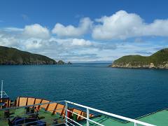 Alweer de "Naked Bus" naar Picton. De bus rijdt een hele tijd langs de kust, een soort waddengebied. Het is laag water dus het ligt droog. Achter mij zit een groep Duitse meisjes te kakelen. Dat ze niet zien waar ze rijden kijk ik niet meer van op. Ze lezen hardop recensies die ze vanuit een of ander gat ten deel zijn gevallen. Ik kan er niets aan doen, maar hard Duits praten irriteert me nog steeds een beetje, zal wel niet meer over gaan. Ik doe de oordopjes maar in en zet de Rolling Stones op; een zegen. Wel landschap, geen gekakel. De bus rijdt de bergen in. Veel schapen op de berghellingen. Verderop hangen de wolken rond de bergtoppen. De oordopjes kunnen uit, ze zijn moe geworden van hun eigen gekakel. Na ruim drie uur rijdt de bus Picton binnen. De boot naar Wellington is een belevenis. Ruim een uur vaart de boot vanaf Picton door een fjord, links en rechts bergen. Bij het naderen van open zee gaat het hard waaien en wordt het behoorlijk fris.